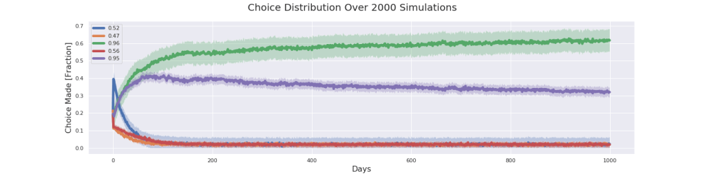 With this method we just need to create our bandit and then run the epsilon_greedy method on it several times and saving the statistics of locations visited for each run. Then we take the average action taken for every time step and we then plot the choices using matplotlib. To make it interesting let’s consider the following problem setup: Three of the locations are very close to each other in terms of probability, let’s say around 50%, and the two remaining locations are very high probability and very close to each other at 95% and 96% percent respectively. We start with epsilon = 0.1 and we run it for 2000 simulations and 1000 days with this setup.