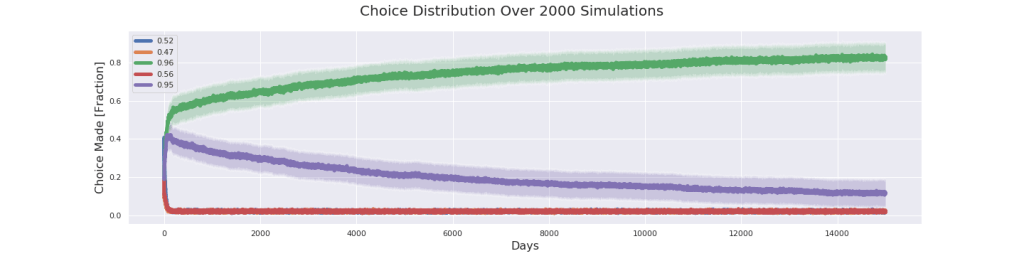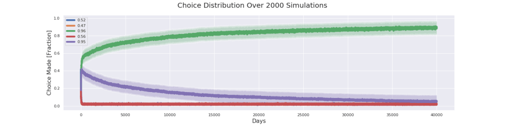 Alright this is about as close as I have patience to go. I’m convinced that the purple line will eventually join the others. At 40,000 days the purple has more or less reached the bottom. In 1931 cases the green location was chosen as optimal and in only 69 cases the purple one was chosen. What this tells me is that it is likely that as the algorithm goes on for longer it converge to the correct choice even when the problem is very tricky.