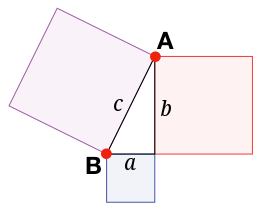To take an easy example, let’s say that A=(3,4) and B=(5,1). The distance in the first dimension is then a = 3-5 = -2 and the distance in the second dimension is b = 4-1 = 3. Thus, we can easily compute the hypotenuse c with the Pythagorean theorem: