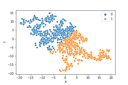 In the bottom data set, the two algorithms also seem to agree quite well with the clustering. The algorithms assigned different numbers to the two clusters, but the clusters themselves overlap very well between the two. In this case the two algorithms only disagree on 13 data points, out of a total of 1000 data points. Note however that for some other data sets the two might disagree more.